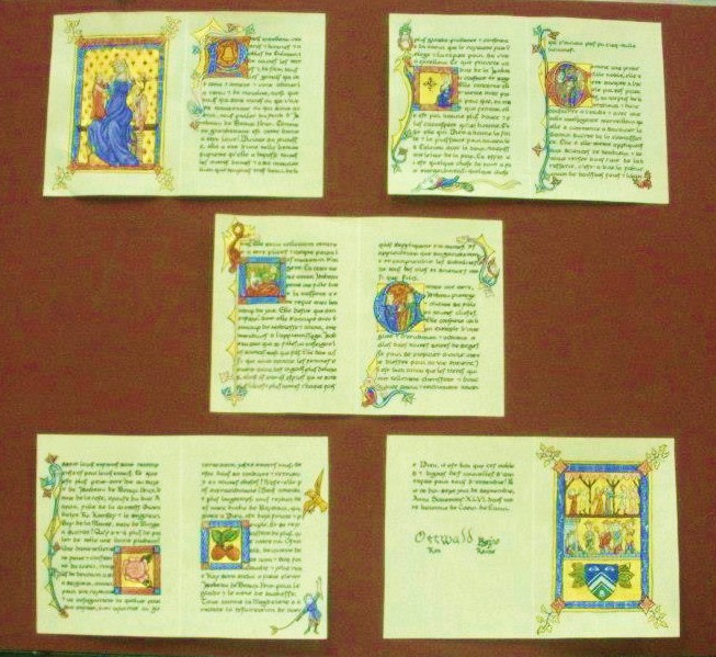 This Duchy scroll was created for Isabeau de Beauxyeux and presented September 17, 2011 at the Coronation of Ostwald II and Kaye II. It’s calligraphy and illumination were done by then HL Elynor of Glastonbury and the text crafted by HG Magdalena vander Meere.The manuscript style is based on the Rothschild Canticles, at Yale University. 14th C French. HG. Magdalena’s text is based on Christine de Pisan’s works, composed in modern French.The Individual five bifolia are 118 x 168mm (4.6 x 6.6in) are framed together on a 406 x 508mm (16 x20in) mat. Elynor’s materials included: pergamenata, period pigments, 23k gold, and black ink.